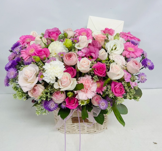 이번에 준비한 꽃바구니는 화사한 핑크 계열의 장미와 리시안셔스, 국화, 거베라를 풍성하게 어레인지한 디자인입니다.