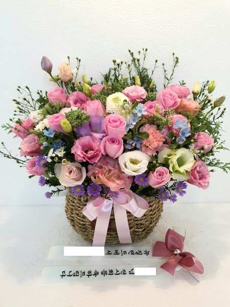 이번 꽃바구니는 핑크톤의 장미, 카네이션, 리시안셔스, 보라공작, 그린소재 등을 중심으로 한아름