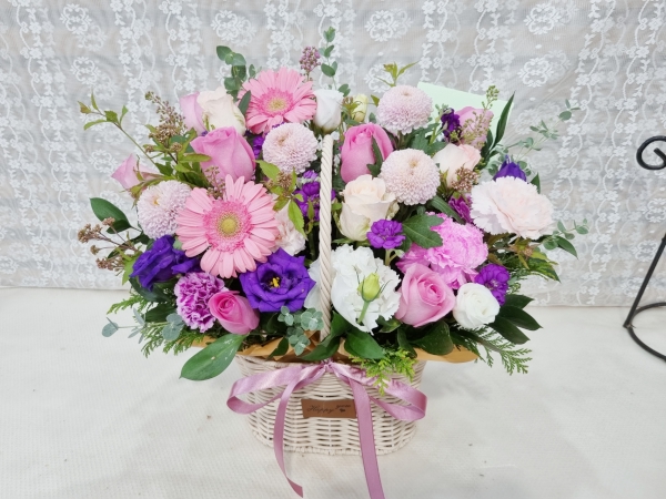 핑크빛 장미와 거베라, 리시안셔스, 보라색 스토크, 소국 등 사랑스러운 컬러감으로