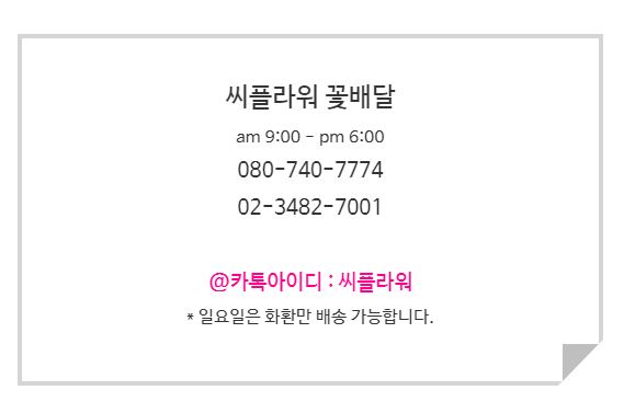 씨플라워 | 조현진 | 서울특별시 영등포구 도림로 371-1층 | 사업자 등록번호 : 114-90-52211 | TEL : 02-3482-7001 | Mail : cflower100@naver.com | 통신판매신고번호 : 제2011-서울영등포-0355호 | 사이버몰의 이용약관 바로가기