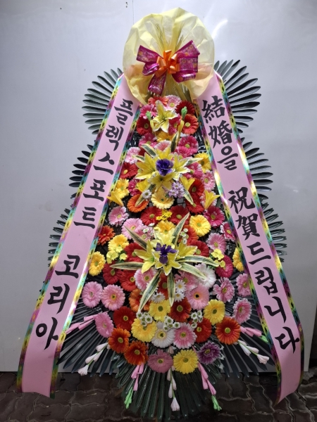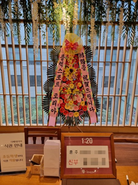 씨플라워는 ‘結婚을 祝賀드립니다’라는 문구를 담은 리본으로