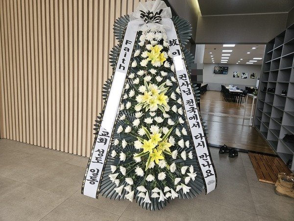 아산 교원 예움 장례식장에 도착한 근조4단 화환이