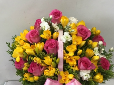 대표적인 봄꽃중 하나인 후리지아와 핑크장미가 콜라보된