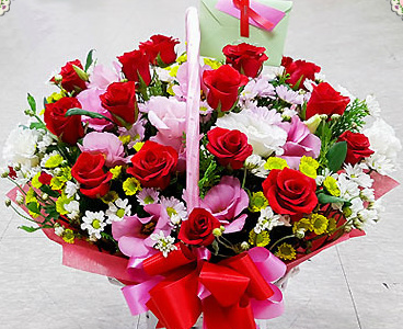 레드장미가 눈길을 확 잡아끄는 매력적인 꽃바구니예요