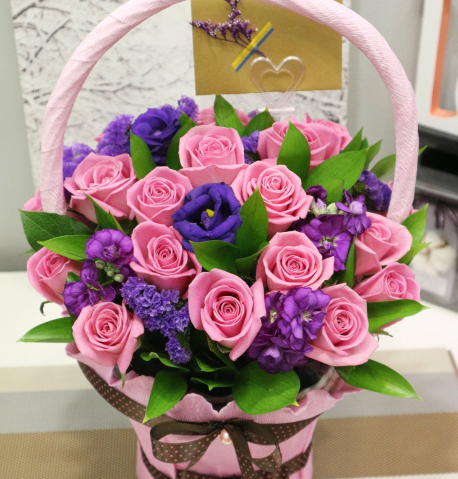 핑크장미와 보라색꽃으로 제작된 꽃바구니인데요