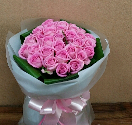흰색의 포장지와 핑크리본으로 포장된 그야말로 여자를 위한 꽃다발입니다