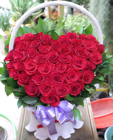 빨간장미를 하트모양으로 만든 꽃바구니입니다