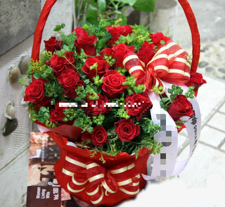 빨간장미와 그린소재의 꽃바구니를 빨간색 주름지로 포장해서 더 강렬해보이는 꽃바구니입니다