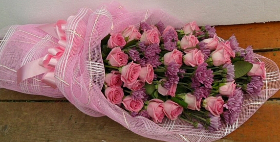 핑크장미와 보라소국이 환상적인 꽃다발입니다