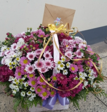 핑크와 보라컬러로 해서 화사하고 풍성해 보이는 꽃바구니입니다