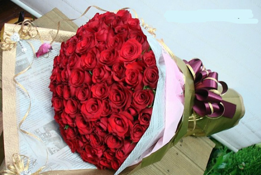 금빛 리본으로 예쁘게 포장한 레드장미100송이랍니다