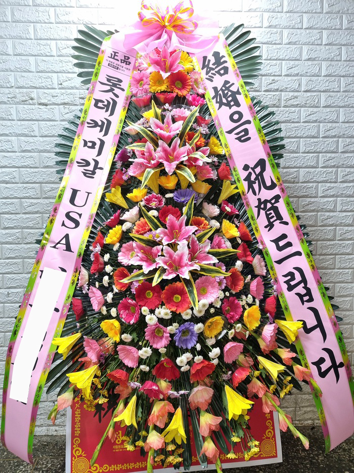 결혼식 축하화환은 예식 1시간 전에 배송되어 하객을 맞이합니다.